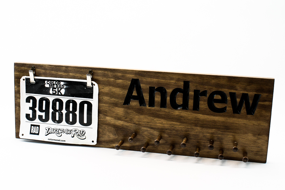 3."Andrew" Running medal display. This race bib and medal holder combo is on a 23"x7" sign. The race bibs are located on the left side and on the right you can personalize the sign with your first or last name. There is also some room for a smaller 2nd line of text if needed. We are very flexible when it comes to design.